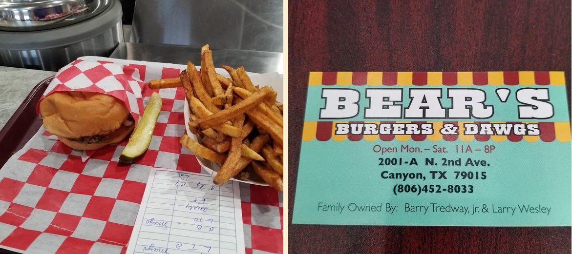Bears Burgers and Dawgs resides at 2001 N 2nd Ave in Canyon, Texas. It offers a taste of traditional American cuisine. Known for its friendly service, it captures the spirit of local dining culture. Starting with a small menu of burgers and dawgs, the community embraced it wholeheartedly. Bears Burgers and Dawgs has developed a loyal following, thanks to its nurturing hospitality. Many locals recommend it for great food during lunch hours.