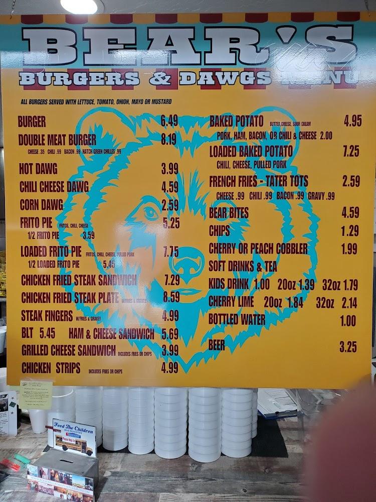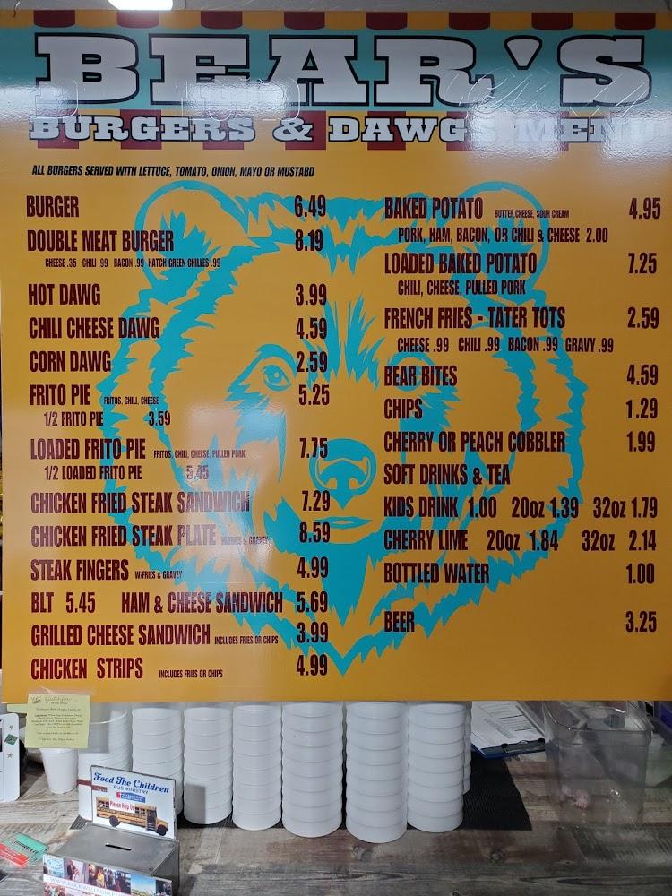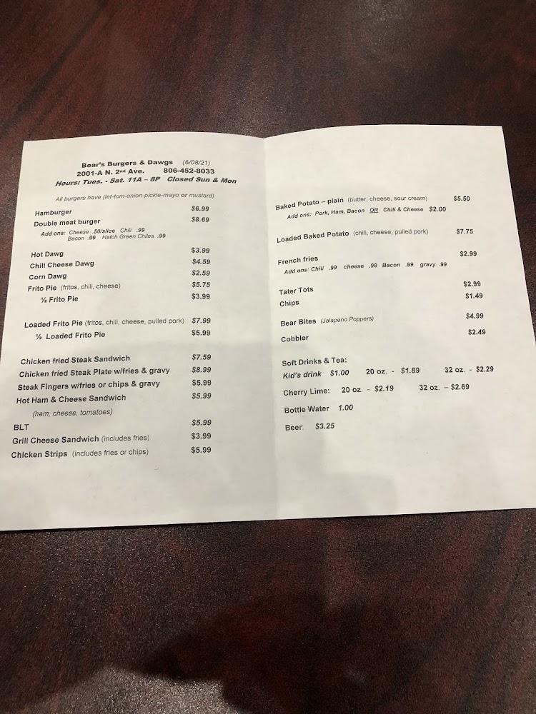 Welcome to Bears Burgers and Dawgs, your local haven for delicious burgers and hot dogs in Canyon, TX! Located at 2001 N 2nd Ave, we offer a cozy and casual dining experience perfect for solo diners, families, and groups. Enjoy our extensive menu featuring traditional comfort foods, complemented by beers and delicious desserts. With convenient services like contactless delivery, takeout, and dine-in, you’ll find fast service and a warm atmosphere. Our fully accessible space ensures everyone can enjoy a meal. Visit us for lunch or dinner and experience why we're a favorite among locals and tourists alike!